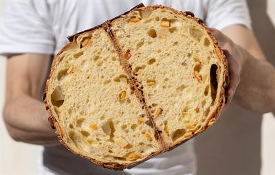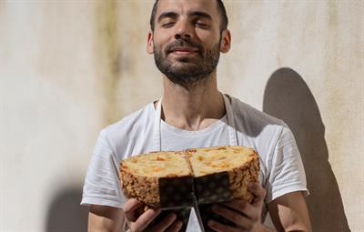 Ingredienti: Farina di GRANO tenero, BURRO, zucchero, scorza candita di agrumi (scorza di: pompelmo rosa, limone; zucchero) 27%, pesca sciroppata (pesca gialla, zucchero) 10%, UOVO, lievito madre, ARACHIDI 3%, Mezcal Alipus San Baltazar 2%, mais 1%, semi di girasole 1%, rapa rossa, miele, sale <1%, amido di mais, peperoncino <1%.